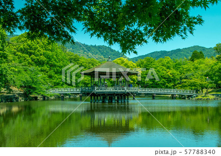 新緑の春日大社 浮見堂 水面への映り込み と もみじ