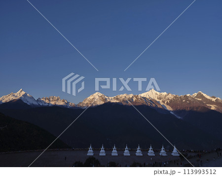 meili snow mountain at sunrise with with white pagodas, yunnan, china