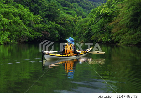 沖縄県西表島 緑が反射する川を進むカヤック