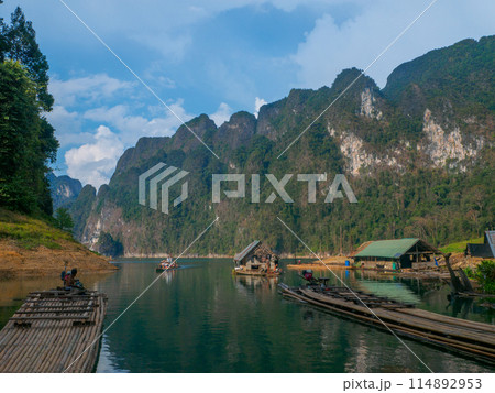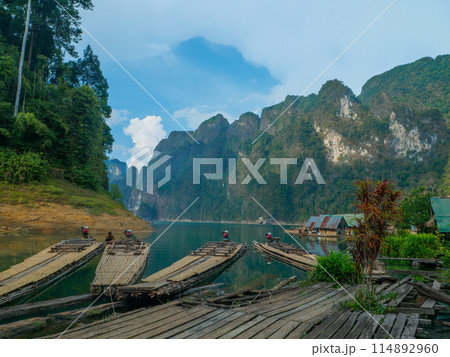 湖に浮かぶ竹製いかだ (タイ王国、スラートターニー県、カオソック)