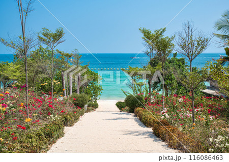 Cheerful asian woman enjoying with the turquoise sea and flower garden at Koh Larngarden at Ta Yai Beach, Koh Larn