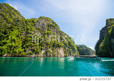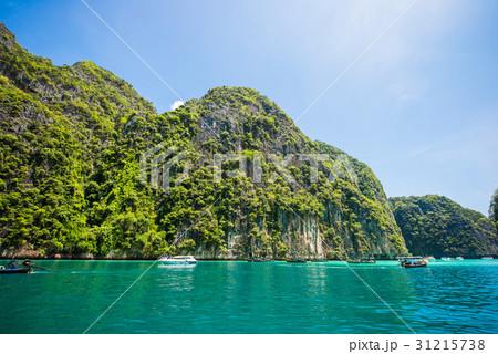The legendary Maya Bay beach without people where the film "beach" with Leonardo DiCaprio was filmed with a beautiful bay of sand and clear turquoise water. UNESCO World Heritage.