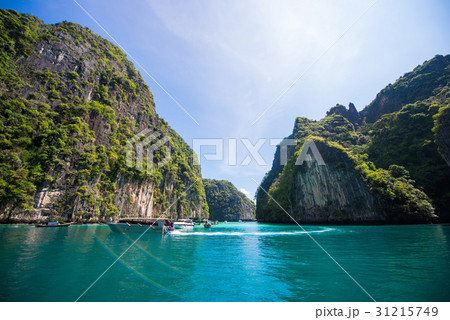 A picturesque beautiful place on the island of Phi Phi Leh - Pi Leh Lagoon is popular for excursions with tourists on traditional Thai fishing boats. Island travel in Thailand.
