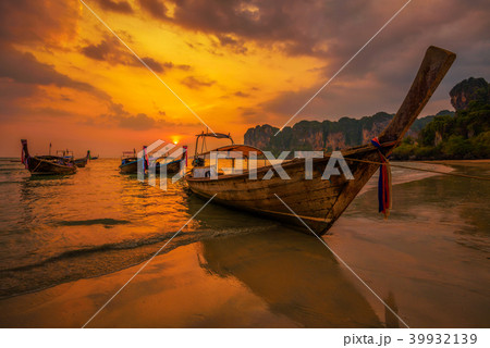 Traditional thai boats at sunset beach. Ao Nang, Krabi province