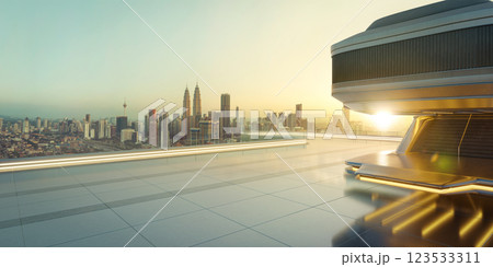 Empty square floor is providing space for product placement with modern city skyline in the background