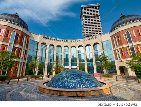 Perpustakaan Kuala Lumpur, aka Kuala Lumpur Library with its distinctive dome fountain and city flags, Kuala Lumpur, Malaysia