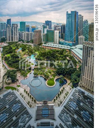 Nov 20, 2019 - Kuala Lumpur, Malaysia: Aerial perspective of KLCC Park at day, dramatic sky, landscaped gardens, water fountains, lakes, skyscrapers, green areas, modern city skyline. Urban planning