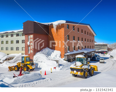 除雪作業をするタイヤショベルがいるスキーリゾートのホテル (長野県、山ノ内町)