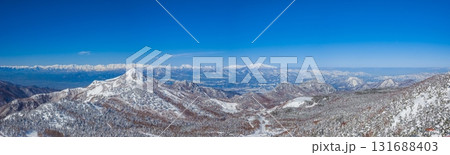 スキー場の中腹から望む雪山と北アルプスの大パノラマ (長野県、志賀高原、横手山)