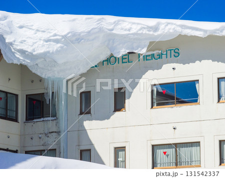 ホテルの軒先にせり出した凍った雪庇と氷柱 (長野県、志賀高原)