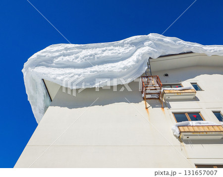快晴の青空とホテルの屋根から大きくせり出した雪庇 (長野県、志賀高原)