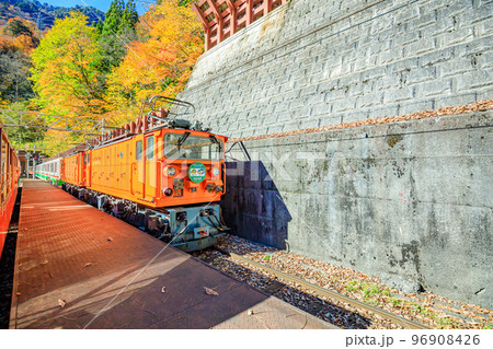 秋の黒部峡谷 トロッコ電車から見た小屋平駅とトロッコ電車 富山県黒部市
