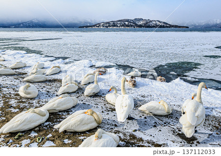 凍結した湖面で休む白鳥
