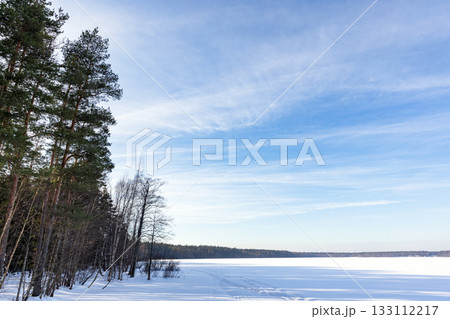 Snowy forest scene with a frozen lake and clear blue sky. Tall pines and bare trees