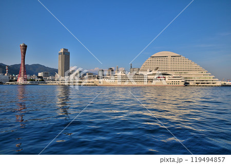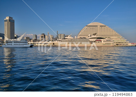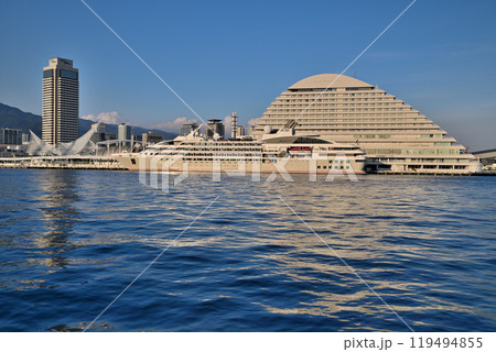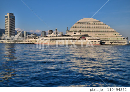 夕陽を浴びる神戸港停泊中のクルーズ船「ル・ソレアル」