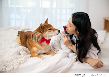 Asian female teenage lovingly petting her Shiba Inu dog wearing red bow tie relaxing on cozy white bed
