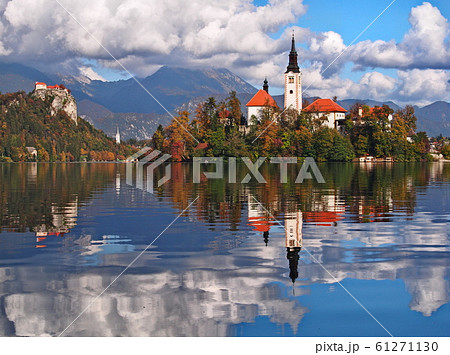 秋の青空とブレッド湖 聖母被昇天教会 ブレッド城