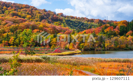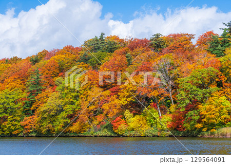 秋の群馬県赤城山の小沼北側湖畔から南側を見る