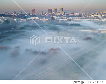 空撮「埼玉県」霧が立ち込める早朝の見沼田んぼ