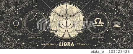 Libra zodiac sign, modern astrology graphic banner on vintage black background with sun and moon. Realistic vintage vector hand drawing, horoscope card.