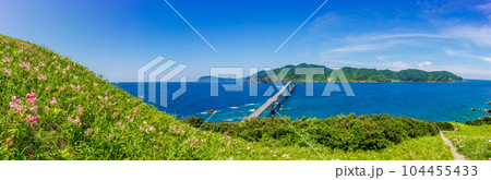 甑島_鳥の巣山展望所 甑大橋と紺碧の海を見下ろし、7月ごろからカノコユリやカンゾウの草原が楽しめる