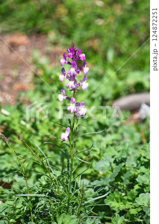 美しい庭園に咲き誇る可憐なリナリアとルピナス