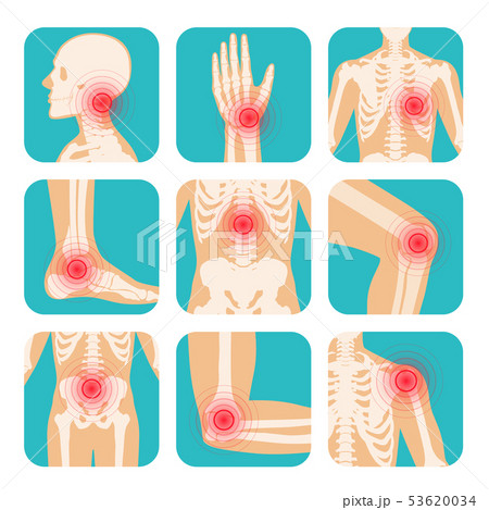 Set of red circle pain localization, human body, skeleton, joints and bones