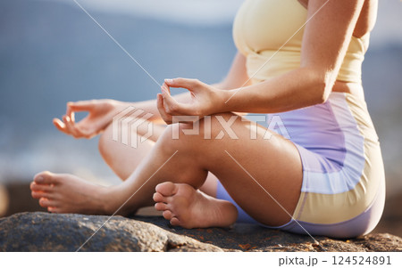 Zen woman, yoga meditation, and lotus hands in mudra pose in nature exercise, workout and peace outdoor rock. Calm energy, health and spiritual person in training for mindset, wellness and relax