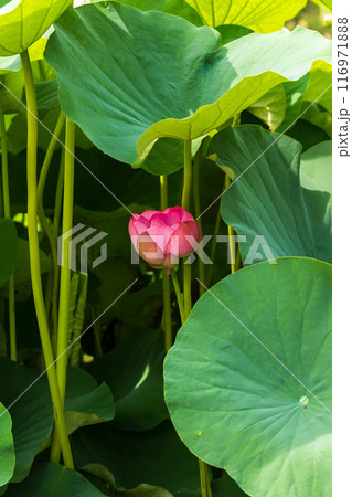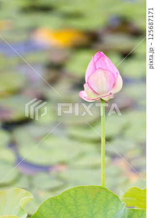静かに立つ蓮の蕾|水面に浮かぶ緑とともに」 "Quietly Standing Lotus Bud