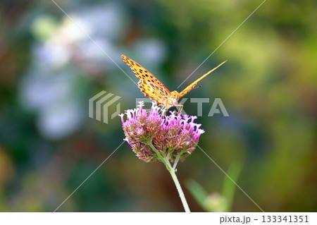蝶々が花の蜜を吸っている光景(イラスト風)