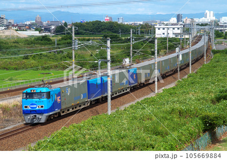 早朝の東海道本線 JR総持寺駅を行く スーパーレールカーゴ 高速貨物電車