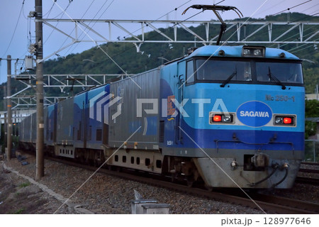 早朝の東海道本線 上牧カーブを行く スーパーレールカーゴ 高速貨物電車