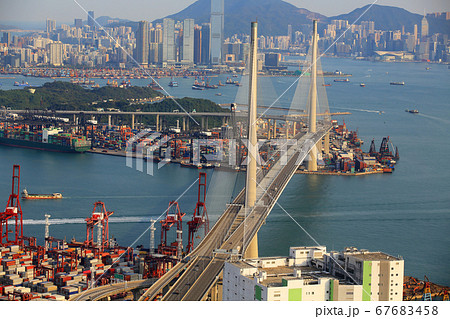 Kwai Tsing container terminal port view in drone, and hong kong skyline and stonecutter's bridge