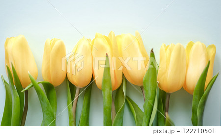 A row of yellow tulips with green leaves. The flowers are arranged in a line and are facing the camera