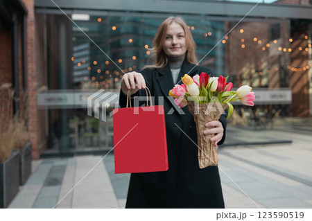 Happy smiling woman wearing black long trench coat, holds a red spring gift package bag and spring flowers, walking in street of European city