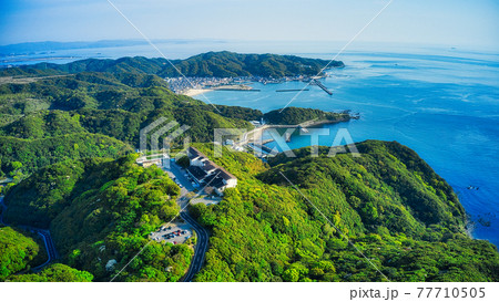 新緑の加太深山砲台跡付近の上空からドローンで加太漁港・休暇村紀州加太を臨む (和歌山県加太)