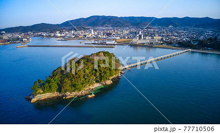 国の天然記念物に指定されている愛知県蒲郡市のシンボル『竹島』と町並みをドローンで空からの撮影