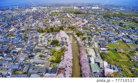 奈良県橿原市の曽我川沿いの桜並木を上空からドローンで全景撮影