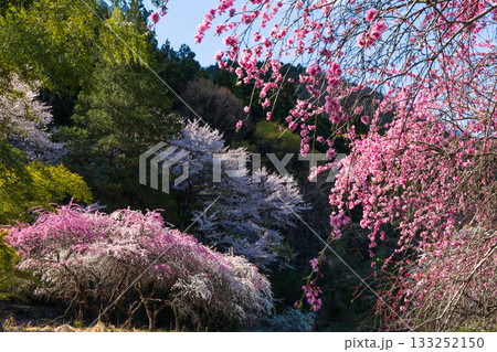 わたらせ渓谷鐵道「花桃と桜の花咲く風景を行く列車」