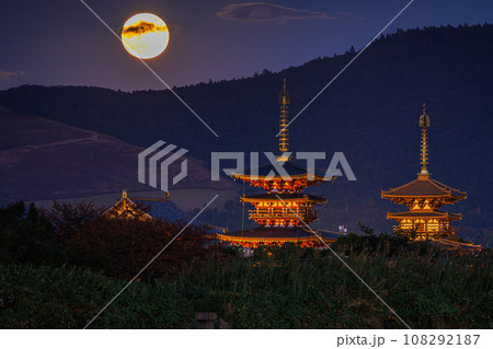 奈良西の京 薬師寺 満月の夜 金色に輝く薬師寺伽藍(縦)