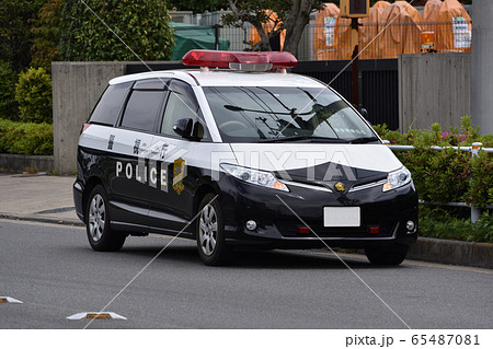 交通取り締まりをする警視庁東京湾岸警察署の警察官とパトカー