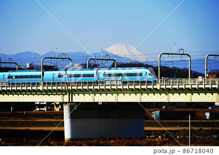 2月 狛江85小田急線ロマンスカーふじさんと多摩川宿河原堰堤