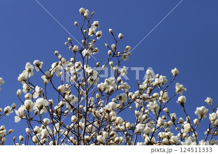満開のハクモクレンの白い花が咲いています。学名はMagnolia denudataです。