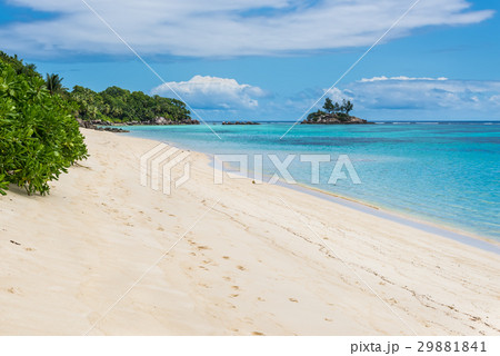 Sandy beach view on a sunny day, Seychelles. Coastal landscape