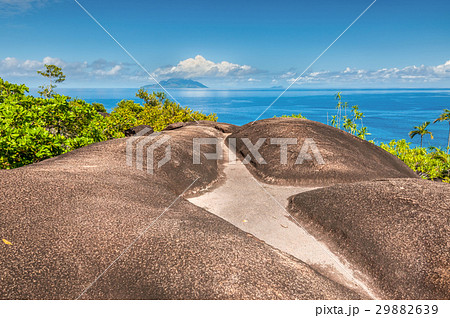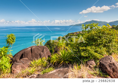 Landscape with the Indian Ocean and large boulders. Mahe Island, Seychelles