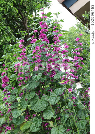 初夏の庭に咲くゼニアオイの赤紫色の花