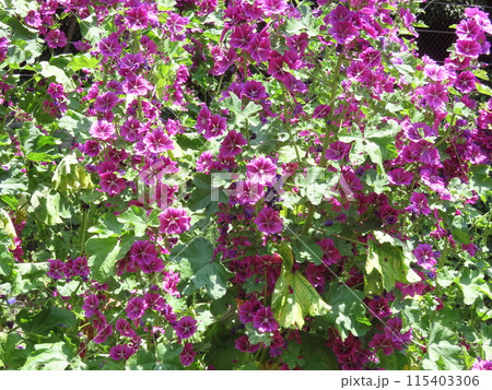 群生して沢山咲いた赤紫色のゼニアオイの花