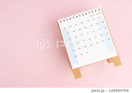 March 2026 desk calendar on pink paper with flower pattern background.