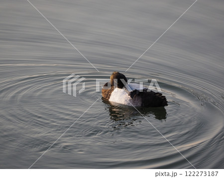 背泳ぎするキンクロハジロ。東京都大田区「洗足池」