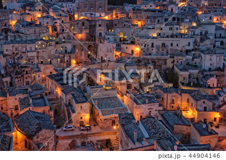 南イタリア、夜のマテーラの洞窟住居群